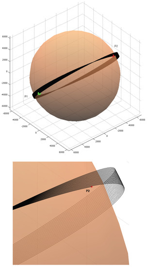 The corresponding trajectories for all successful runs for Problems #1–3 appear in Figure 6, Figure 7 and Figure 8, respectively. In some cases, trajectories lie on top of each other and are not visually distinguishable. The right-hand panels of Figure 6, Figure 7 and Figure 8 show close-ups of the successful trajectories after DE but before refinement with fminsearch (note the zoomed in scales of the axes). After refinement with fminsearch, the successful trajectories are all <0.3 m from the target, so they would appear indistinguishable on these figures. For Problem #4a, we show all five orbits of only the single best trajectory in Figure 9; note the precession of the orbits toward the target point . The precession is even more noticeable in the trajectory for the twenty-orbit intercept of Problem #4b (Figure 10).