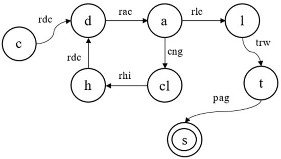 The transitions are correct: c → d → a → cl → h → d → a → cl → h → d → a → l → t → s is an acceptable path in the formal model. This is correct in the given scenario. There are 13 transitions between c → s, the starting sequence is c → d → a, and the ending sequence is l → t → s. P3, P4 and P5 are met.