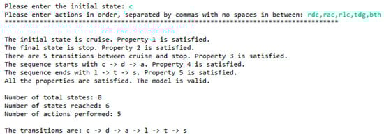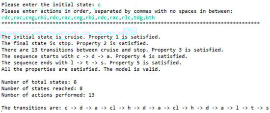 Now that it has been performed manually, it can be compared to the model checker. When this data was input into the model checker, the output shown in Figure 7 was obtained.