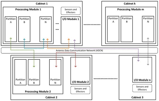Avionics systems have undergone transformations since first aircraft have flown. They have gone through changes due to technological innovations to provide airborne capabilities (mostly required for aircraft management). The updates include typical avionics equipment for communication, navigation, and surveillance systems and technologies for vehicle systems such as flight control systems, fuel systems, and hydraulic systems. This continuous improvement and modernization brings along an inexorable evolution of the avionics architecture. The evolutionary process of architectural avionics approaches goes from former centralized and analogue solutions to latter decentralized and digital ones []. The latter involve networked computers and entail distributed, federated, and integrated avionics architectures. They are more lightweight (reduction of wiring) and efficient (reduction of power consumption) than former solutions whilst providing higher performance (although they are more complex and expensive). They also facilitate the realization (implementation and integration) of Distributed Avionics Applications (DAAs), mainly favoring systems dependability due to the fault tolerance provided by the distribution of functionalities.