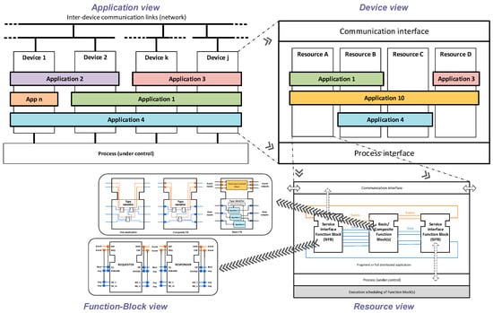 Figure 3 shows the application-device-resource-FB encapsulation method of the IEC-61499 standard. Clockwise from top-left to bottom-left, applications can be deployed in one or more devices (application view). On the top, devices are connected with each other through a network, and linked with the process under control (bottom). Devices (e.g., control computers or instruments) can have one or more resources that are able to contain deployed FBs. FBs are for computation and communication. Computation FBs are classified as basic FBs, composite FBs, and sub-application FBs. Communication FBs are generally categorized as requester and responder FBs.