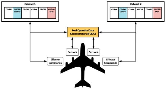 The CPIOMs are interconnected with each other, the Fuel Quantity Data Concentrators (FQDCs), and the Integrated Refuel Panel (IRP). The FQDCs are data acquisition units to compute fuel quantity data and get feedback from effector signals (Figure 5). The FQDCs are originally connected to the CPIOM via ARINC 429 and are not an IMA module (CPIOM). The avionics configuration of the above FMMS is twin for redundancy. However, the case study considers no redundancy and that the FQDC is included in the CPIOM and connected via TTP (instead of ARINC 429).