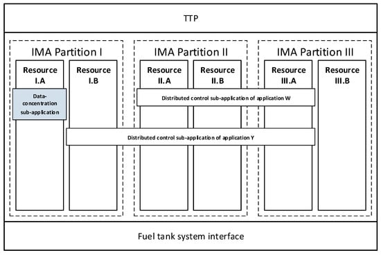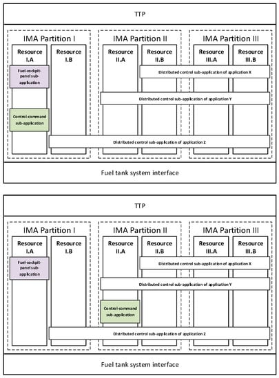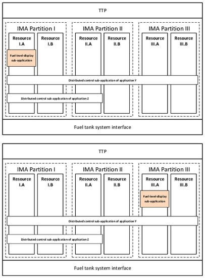 Figure 9 shows the CPIOM-Monitoring device along with its resources and how the sub-applications are deployed in resources. Each IMA partition entails two resources. The fuel-level-display sub-application is only deployed in resource I.A (partition I) in scenario 1, and it is deployed in resource I.A (partition III) in scenario 2. CPIOM-Sensing device can also deploy other DAAs such as the distributed control application Y and Z.