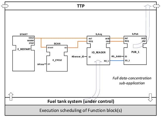 The FMMS platform executes a control software application deployed across the controlling and monitoring CPIOMs. This DAA is modelled by the IEC-61499 standard. It was modelled by means of the Function Block Development Kit (FBDK) [], and experimental results are available in an earlier publication []. The IEC61499-compliant DAA model is divided into the following sub-applications: control command, fuel cockpit panel, fuel level display, and data sensing concentration. It is deployed in three different IEC-61499 devices (as each CPIOM is modelled): (1) a CPIOM-Control, (2) a CPIOM-Monitor, and (3) a CPIOM-Acquisition, i.e., the Fuel Quantity Data Concentrator (FQDC). Figure 6 shows how the FMMS DAA is distributed over the CPIOMs. The full FMMS DAA and its FBs (without the interface service FBs) are shown in Appendix A.