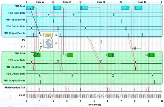 Figure 14 presents four cases of execution for two FBs (computation of and communication between FB1 and FB2 (based on the FB execution timing []). Case A shows an example of on-line scheduling (only one partition). FB2 is executed in the next positive clock edge as soon as FB1 finishes. Case B shows an example of off-line scheduling (only one partition). FB2 is executed in the next IMA-TTP platform execution tick edge as soon as FB1 finishes. Case C shows an example of off-line scheduling (more than one partition). FB2 is executed in the next IMA-TTP platform execution tick edge (in a different partition or even device than FB1) as soon as FB1 finishes. Case D shows an example of off-line scheduling (one or more than one partition). FB2 is executed in the next IMA-TTP platform execution tick edge (in a different device than FB1) as soon as FB1 finishes. There is also a second execution of FB1, of which the output is not considered by the FB2 execution. This situation is handled in a similar way for any scheduling case (first-come, first-served basis for events-data enablers).