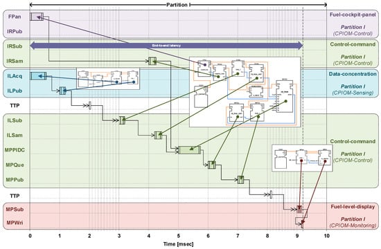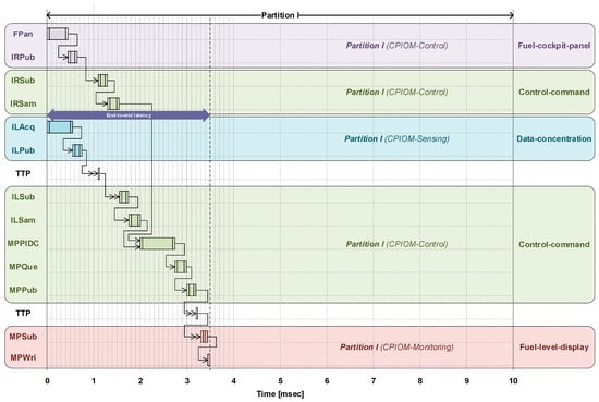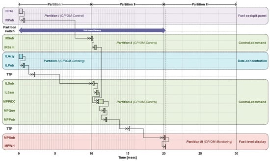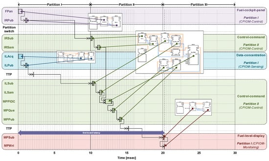 The case study focus is on the ITT control. This entails the following functionalities: pilot interface, ITT sensing, mid pump control, and fuel gauging. Thus, functionalities (FBs) related to the ITT are considered for simplification of the case study. However, this does not invalidate the demonstration of fully-deterministic execution for FBs. Two scenarios are investigated to analyze the DAA performance. DAA sub-applications are deployed in only one resource per device in scenario 1. There is a similar deployment situation for the DAA sub-applications (in scenario 2) except for the control-command and fuel-cockpit-panel sub-applications, which are deployed in different resources (partitions) from CPIOM-Control (device). Hence, the control-command sub-application is distributed in two different resources (within the CPIOM-Control device), and the fuel-cockpit-panel sub-application is deployed in a third resource of the CPIOM-Control device in scenario 2.