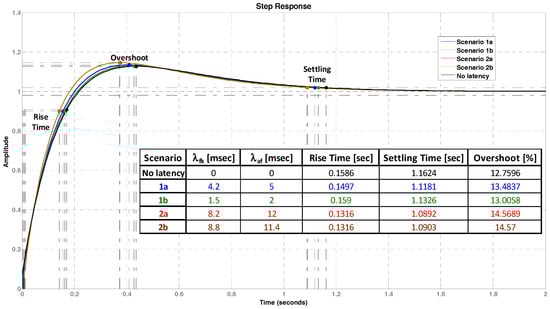 A comparison between characteristics of the FMMS response without and with latency for the worst cases (longer times and larger overshoots) shows that a variation of (1) the rise time of 0.027 s decrement (scenario 1b, deterioration), (2) the settling time of 0.0732 s decrement (scenario 1b, improvement), and (3) the overshoot of 1.81% increment (scenario 2b, deterioration).