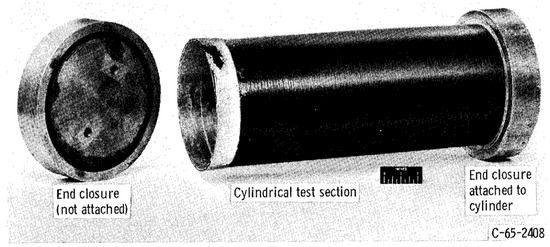 where σhoop and are the COPV hoop stress and uni-directional ultimate stress of the COPV composite material, respectively. In the case of the pressure cylinder tests, the COPV hoop stresses were taken as the stress values in the composite plate endcaps as given in references [3,4]. However, in the case of the pressurized bottle tests, the COPV hoop stresses were calculated using the equation: