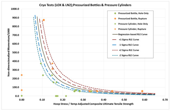 As can be seen in Figure 4, with the exception of the two ruptured unpressurized pressure cylinder tests, the RLE developed herein appears to predict fairly well the rupture/non-rupture response of COPVs at cryogenic temperatures. This is supported by the “tightness” of the confidence-bound curves about the RLE—another indication of the goodness of fit of the RLE to the rupture/non-rupture data. A possible explanation for the rupture of the two unpressurized cylinders is offered in reference [3]—namely, that the resins in these two tests had high percentages of organic polymeric matter. In the presence of liquid oxygen, this possibly made them highly susceptible to a catastrophic response, even without any internal pressure.