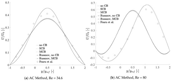 The computational cost is shown in Figure 6, which shows an interesting trend. The AC method is know to have slow convergence properties at low Reynolds numbers, see for example [22,23]. We see the same trend in Figure 6a, where the computational time required grows exponentially as the Reynolds number approaches zero. The non-CB and MCB scheme require substantially more CPU time than the SCB and RS-based approaches, however, the latter did not predict the bifurcation at all. The reason here is that the flow will always develop as a symmetrical flow, even for Reynolds number above Re. After the residuals have dropped to about , the numerical fluctuations become small enough so that the physical fluctuations can promote a different and more stable equilibrium position. At this stage, the reattachment point at the upper and lower wall start to interact with the upstream pressure at the convex corner points and slight physical fluctuations—which obtain their energy through the non-linear term—promote the change to a non-symmetrical flow pattern, which is also discussed by Oliveira [38]. Therefore, results obtained for the bifurcated state may in general require more computational time. At the critical Reynolds number, both the AC and FSAC-PP method peak in terms of the CPU time. It is here that the physical fluctuations become just important enough for the flow to register the change to a non-symmetrical state. At higher reynolds numbers, their effects may be felt stronger and earlier during the calculation which may force the bifurcation to occur earlier and thus with increasing Reynolds numbers, the computational time decreases again. When only considering the non-CB and MCB scheme of the AC method, which eventually bifurcate, it can be seen that the same simulation using the FSAC-PP method requires 2–3 times less CPU time sufficiently far away from the critical Reynolds number. This is consistent with findings of previous works in which it was highlighted that the FSAC-PP method generally performs faster than the AC method while retaining a high level of accuracy [22,23,28,30]. At Reynolds number close to zero, the computational savings are even more significant. This was one of the reasons the FSAC-PP method was developed in the first place, to overcome the stiff nature of the AC and Pressure Projection method for low Reynolds number flows, for example in microfluidic applications, see [23] for a detailed discussion. At the onset of bifurcation, however, the AC method seems to be slightly more cost efficient than the FSAC-PP method. This can be explained by the elliptic behaviour of the Poisson solver, where any pressure change is propagated through the domain instantaneously. These pressure waves require longer to be damped while the hyperbolic behaviour of the AC method induces less pressure waves and hence a converged solution is found quicker.