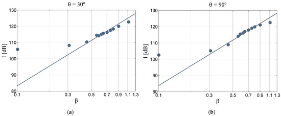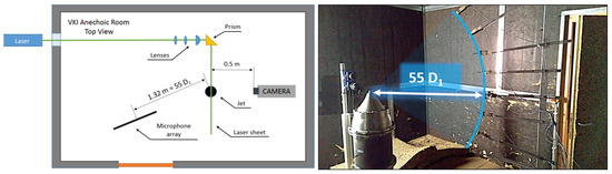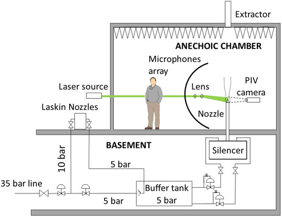 A vertical microphone polar array is located in the anechoic room comprised of 11 microphones, equally spaced to cover a range of polar angles from 30 to 130. The PIV optical bench, containing all the devices necessary to generate the laser light sheet and the cameras to record the images, is also placed inside the anechoic chamber. The laser head and its cooling system are kept outside of the room, since they are sources of spurious noise. A sketch of the final setup of the facility is shown in Figure 15. The nozzles used are the first set built, described in Section 3, with mm and mm for the primary and secondary jets, respectively. For this study, both the nozzles have been installed, but only the primary flow has been used. The seeding generator is a PivPart-45M, by PIVTEC Gmbh, composed of 45 Laskin nozzles, with 5 bar as the maximum outlet pressure. The manufacturer’s user manual [24] reported a peak in the particle size distribution function around m for vegetable oil. In this work, the seeding used was the industrial oil Shell Ondina-919. The Laser Extinction Spectroscopy [25] (LES) technique has been used at VKI by Mandon [26] to verify the seeding size distributions for this oil. The results show that the distribution is centered around 0.5 m for most of the tested conditions, thus suitable for this investigation.