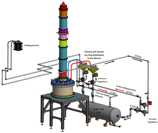 The flow enters the circuit at 35 bar (bottom left of Figure 1). An electrical ball valve with a safety return battery is used as the main ON/OFF shutter. A manual ball valve is placed upstream as backup. Successively, the pressure is decreased from 35 to 10 bar by means of two identical pressure regulators. This solution was necessary to fulfill the required volumetric flow. Downstream the twin regulators, part of the flow is diverted to the seeding generator, while the rest of the flow enters the buffer tank. A pilot-controlled pressure regulator lowers the pressure from 10 to 5 bar.
