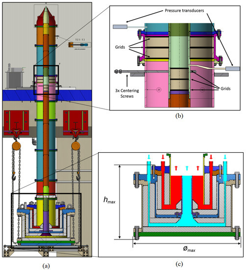 Downstream the silencer, the two flows are guided by vertical coaxial ducts into the anechoic chamber. Each duct is equipped with honeycombs and three fine turbulence screens. The ducts’ internal diameters are mm and mm for the primary and secondary flows, respectively. For the designed test campaigns, the Mach number in the ducts is lower than M = 0.05, and thus, the static pressure, measured upstream the nozzles, is considered to be the total pressure.
