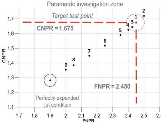 The parametric investigation chart. The perfectly expanded condition is shown as a reference, but it is not the subject of investigation.
