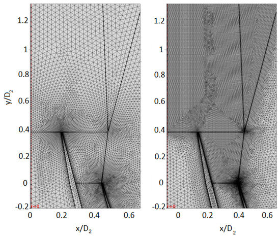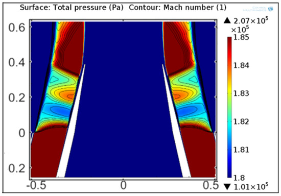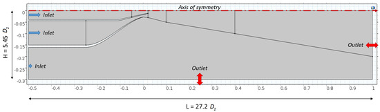 The simulation of the coaxial flow has been carried out using a RANS k- model. The computational domain is rectangular, extending 18.1 downstream and 9.1 upstream the nozzle in the axial direction, 5.5 in the radial direction. The ambient pressure is = 101,325 Pa, and the initial temperature was set to 293.15 K. Three inlet boundaries are present at the left of the domain, two boundaries inside the nozzles (, , K, ) and the third outside ( = 101,325 Pa, K, ). The outlet boundaries are the side and bottom edge of the domain with = 101,325 Pa. A no slip boundary condition is applied to all surfaces of the nozzle. A picture of the simulation domain is depicted in Figure 10. The simulations have been carried out varying only the total pressure at the two nozzle inlets.