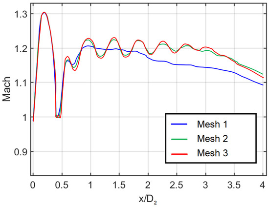 The three meshes have been compared in Figure 12 by plotting the Mach number extracted in the supersonic region over a straight line. The line is arbitrarily defined due to the fact that the maxima and minima of the Mach number in the jet do not lie on the centerline. The line, depicted in Figure 13a, is identified by the extremes A(0.32, 0.00) and B(0.24, 4.00), where the coordinates are non-dimensionalized by the secondary nozzle diameter . In this reference system, is the radial direction, the axial direction and the origin the intersection between the axis of symmetry and the exit plane of the secondary nozzle. The graph shows how the results for Mesh 1 have poor resolution in comparison with Mesh 2 and Mesh 3. The Mesh 2 is capable of calculating the first peak in accord with Mesh 3, but the amplitude for the other peaks is slightly different. In conclusion, because of the relatively high computational cost of Mesh 3, it has been decided to carry out all the simulations using the Mesh 2.