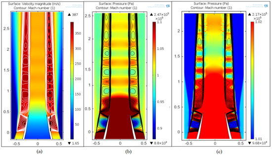 Results of RANS simulations of the coaxial jet. Axis units are non-dimensionalized by . (a) The velocity field and (b) the pressure field at Condition 01. Mach contour lines in white are superimposed. Data extraction is performed along the dashed black line. (c) The pressure field in Condition 07. Mach contour lines in black are superimposed.