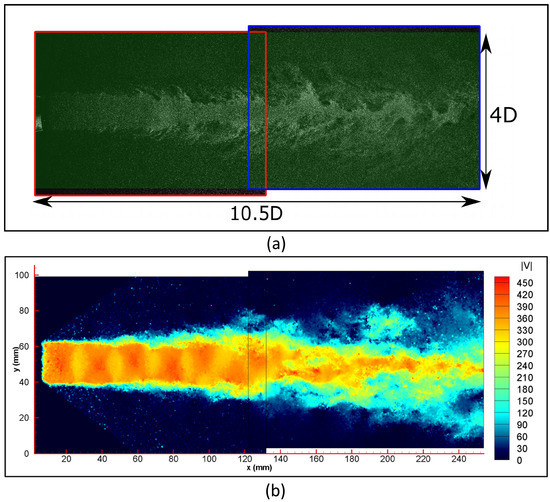 The recording system is composed of two LaVision Imager SX4M cameras (2360 × 1776 pixel2) located at a distance of 0.5 m from the jet axis. Acoustic tests have been carried out to ensure that at such a distance, the acoustic field emitted by the jet was not perturbed. The cameras are placed vertically in order to enlarge the total field of view in the axial direction of the jet, although a little overlap between the field of view of both cameras is set up in order to allow the construction of the final one by joining them.