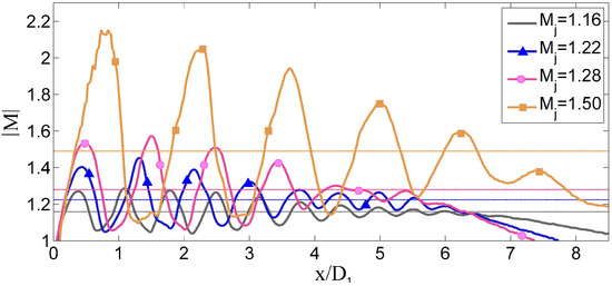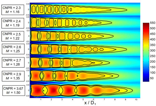 An annular shock-cells system is visible, starting from the exit of the secondary nozzle and surrounding the primary jet. At all the simulated conditions, a strong, conical, shock-wave is present, starting from the lip of the primary nozzle and refracting back into the flow when reaching the external shear layer (Figure 13). After the shock, the flow is locally subsonic, becoming again supersonic after a little distance, leading to the formation of annular shock-cells in the jet, between the internal shear layer and the external shear layer.