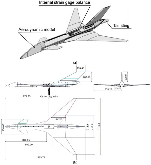 The prospective civil transport aircraft called TransCruiser (TCR) was designed to operate at transonic speeds. The conceptual design of TCR was implemented by SAAB (Sweden) within the SimSAC project of The Sixth European Framework Program. The aircraft is a configuration with a high-sweep wing with leading edge extension (LEX) and a high-sweep canard surface. The canard is an all moving surface and a close-coupled type. The main geometrical parameters of the tested TCR model were as follows: reference area , wing span m, mean aerodynamic chord m. The general view of the TCR model is given in Figure 1a, and a scheme is shown in Figure 1b, where the model conventional center of gravity is marked. The experiments were conducted in the TsAGI T-103 wind tunnel with the flow velocity with corresponding Reynolds number .