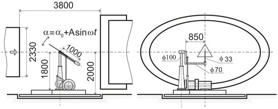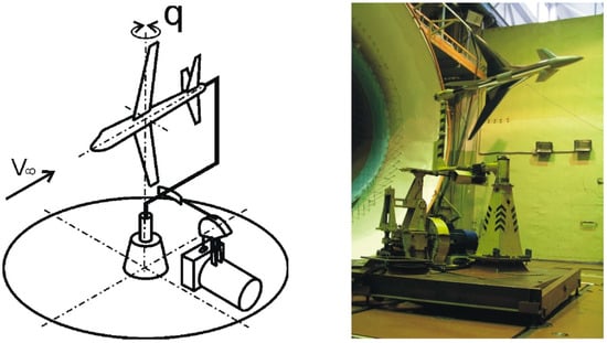 The oscillation amplitude was , frequencies f were 0.5, 1.0, and 1.5 Hz (corresponding reduced frequencies were 0.012, 0.023, and 0.035) with the mean angles of attack varying from −10° to 40°. For small amplitude forced oscillation experiments the data were sampled 128 times per period of oscillation, each oscillation was repeated 8 times. No special adjustments of the sampling rates depending on the oscillation frequency were carried. These experiments were performed on the forced angular oscillations dynamic rig used in the TsAGI T-103 wind tunnel. The rig is shown in Figure 2. The rig kinematical scheme is shown on the left side, and the TCR model installed on the rig during the wind tunnel tests is shown on the right side. The mean angle of attack was specified with rotation of the wind tunnel turn table, and variation of the angle of attack was obtained via oscillation of the supporting sting.