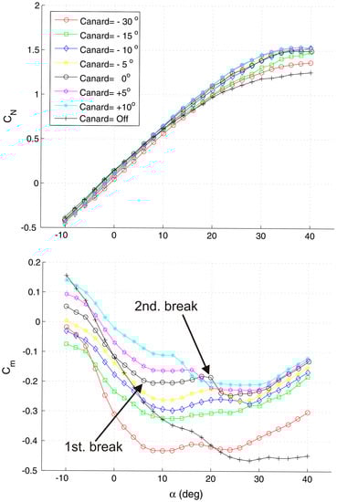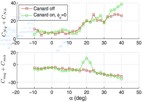 The influence of the canard deflection angle was also investigated: the positive canard deflection moved the positive damping region to lower incidences, with the amplification of the phenomenon as compared to the case of (Figure 8). The negative canard deflection moved this region to higher angles of attack, with the positive damping being weakened. For the canard deflection angle , the positive damping moved to . For the normal force derivative, such a considerable effect is not observed.