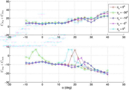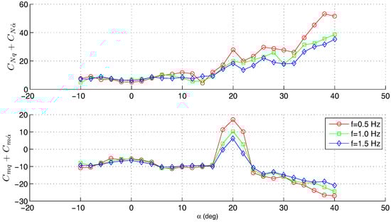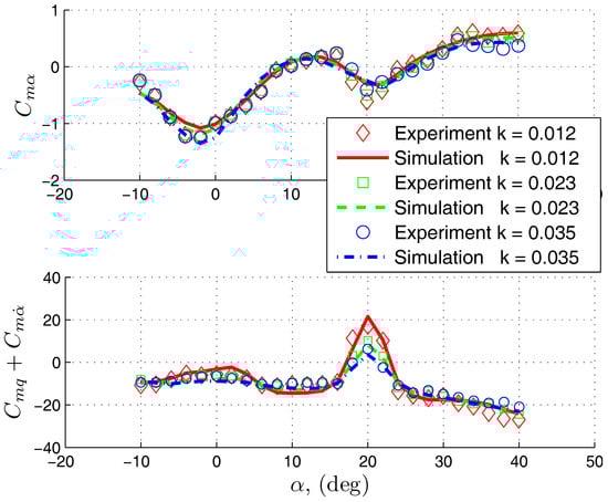 The small amplitude oscillations are dedicated to determine the aerodynamic derivatives in Equation (1). The experimentally measured aerodynamic derivatives and are shown in Figure 6.