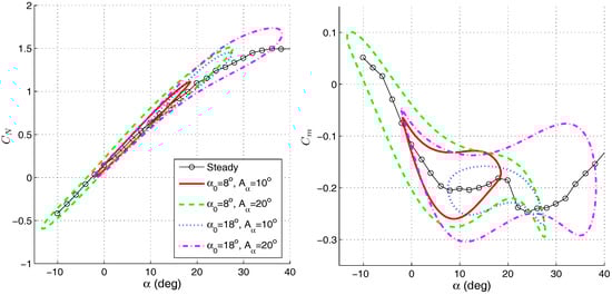 where α is the angle of attack, x0 describes the steady dependency of x on α, and τ1 and τ2 are characteristic times of the flow structure development. This approach was shown to be effective in accurate prediction of the unsteady aerodynamic effects, including unsteady flow over an airfoil with separation [], a delta wing with vortex breakdown [], and a maneuvering fighter aircraft []. Furthermore, this approach was improved in order to take into account more complicated flow effects. Following this technique, aerodynamic loads can be divided into linear non-delaying and nonlinear delaying components [,]. Ordinary differential equations are responsible for the internal dynamics of the nonlinear components of aerodynamic characteristics. The characteristic time constants can be identified using the dynamic wind tunnel [,] or CFD [] test results. Such an approach enables us to describe quite precisely the nonlinear behavior of unsteady aerodynamic characteristics at high angles of attack, namely, the dependence of aerodynamic derivatives on frequency and amplitude of oscillations and the aerodynamic hysteresis. Nevertheless, application of the state-space-based phenomenological approach in an arbitrary case is complicated because of non-formalized and expert-based procedure of the model structure design and identification of the nonlinear components of unsteady aerodynamic characteristics.
