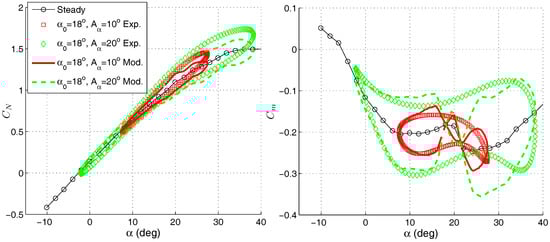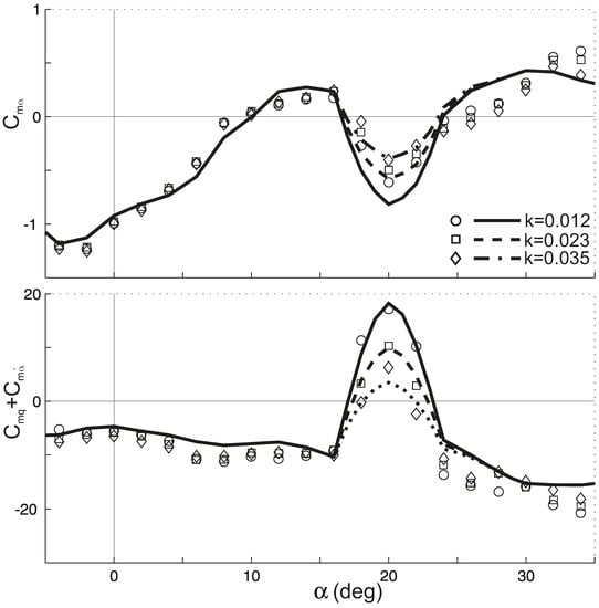 where , and are derived from the look-up tables of characteristics through the linear approximation. While modeling large-amplitude oscillations, the complexes and determined for the same oscillation frequency are used. The results of simulation large amplitude pitch oscillations are shown in Figure 10. One can see that the large amplitude oscillation results for the normal force coefficient can be described with a good precision using the look-up table approach. However, while the simulation of the pitching moment coefficient evolutions fits sufficiently well with the experimental data practically in the overall range of angle-of-attack range, there is a region of the incidences in the vicinity of α = 20°, for which this approach is failed to predict the experimental results. These modeling results are in good agreement with the small-amplitude test data given in Figure 6. Particularly, one can see that canard introduce the nonlinear behavior mostly for the pitching moment derivative , while it effect on the normal force derivative is not so vivid. The canard influence is observed in the vicinity of α = 20°, where the nonlinear dependency of the pitch moment derivatives on pitch rate is observed in the experiment (Figure 6), and the linear model failed to describe the experimental results.