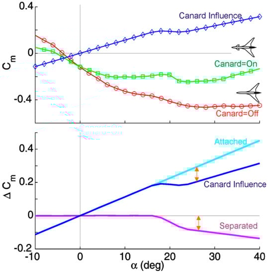 The canard contribution under the static condition is divided into a term , which is linear in angle of attack, and a nonlinear term which is caused by the canard influence as follows: