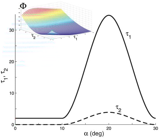 It is seen that the aerodynamic derivatives depend on the oscillation frequency in the range of the angles of attack where the nonzero derivative exists. The dependencies of aerodynamic derivatives and versus oscillation frequency are determined by the characteristic times and . These values are supposed to be functions of the angle of attack and determined as the smooth cubic spline interpolations in the range of with the spline maximum in the center of the range (see Figure 9). It is considered that (α) = 0 beyond this range. The same assumption for leads to the degeneracy of differential Equation (4); therefore, = 2 is added to the spline function . This small addition does not influence significantly the filter characteristics in the left side of Equation (4), but enables the coefficient in front of derivative to be positive. For identification of these constants the following penalty function is introduced: