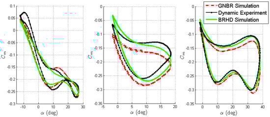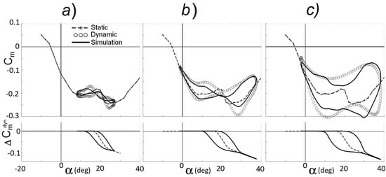 The modeling results of the dynamic effects at the mean angle of attack of the pitch oscillations with large amplitude and small reduced frequency k = 0.012 are shown in Figure 14a. The positive damping in the sense of the linear mathematical model (1) is observed at angles of attack in the vicinity of . The additional kink in the dynamic loop demonstrates this fact. While the oscillation amplitude increasing, the positive damping practically vanishes in both the experiment and the simulation (see Figure 14b). Further oscillation frequency growth leads to a significant expansion of the hysteresis loop. This effect in the experimental and simulation results is shown in Figure 14c.