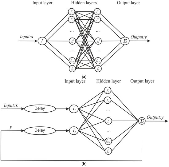 NN architectures: (a) FFNN architecture; (b) NARX architecture.