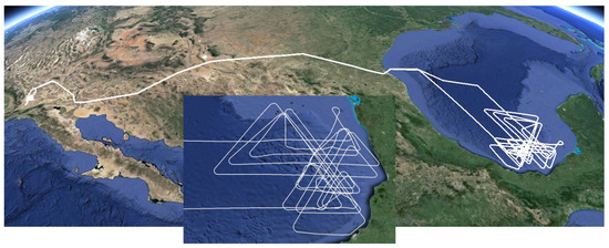 Figure 2 provides a general view of Mission 872-0062. The mission departs from DFRC and crosses the continental United States (U.S.) through an approved corridor near the U.S.-Mexico border. Once over the Gulf of Mexico, the RQ-4A cruises at high altitude to its intended mission area over the Gulf itself. The RPAS performed a triangular scanning pattern designed to cover the whole Gulf while chasing hurricane formation information. The actual mission area and trajectory change over time to track relevant atmospheric events identified by real-time satellite data or by onboard sensors. The overall mission time exceeds 24 h of high-altitude flight.
