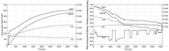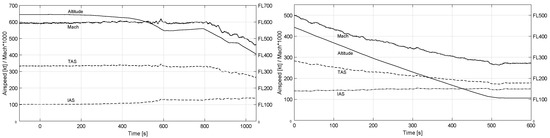 Finally, it is worth noting that the analysis of the climb and descent profiles shows that the RQ-4A speed management in both phases of the operation is equivalent; that is, the RQ-4A speed is only dependent on the actual altitude and independent of the phase of the flight.
