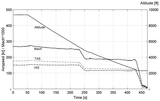 Landing at DRFC starts with the Global Hawk descending from FL100 down to touchdown altitude (see Figure 6 for Mission 872-0060). The landing sequence is initiated at an approximate altitude of . Operation 872-0060 shows a clear transition at around 4830–4585 ft, which is interpreted as related to the landing gear extraction, combined with an apparent decrease in speed.