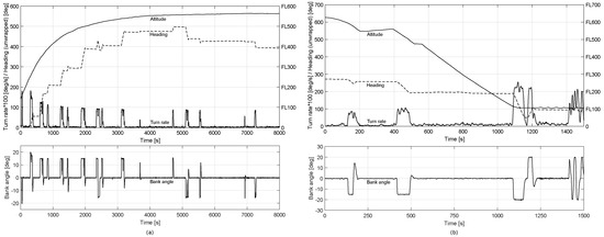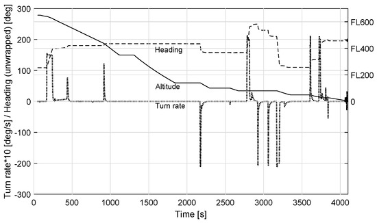 The profile of the 872-0060 mission, coupled with the aircraft bank angle, turn rate and heading change, is shown in Figure 7. The profile is divided into two parts: the climb on the left and the descent on the right. Most of the operation, with the RQ-4A in cruise climb, has been omitted. The image also shows the aircraft heading, and changes in that value can be easily coupled with those instants in which the RQ-4A bank angle differs from zero.