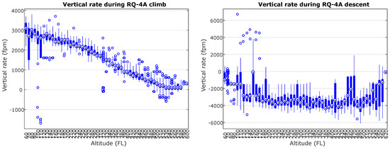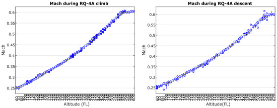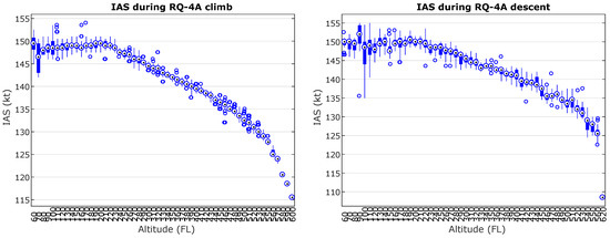 Figure 8 depicts IAS during climb and descent operations. The diagrams show that the IAS profile is dependent on the altitude and that it is equivalent to climb and descent. IAS variations are more substantial at low altitudes, mainly due to the combinations of small ascents and descents that occur during the RQ-4A departure and especially during its arrival phase. Also relevant is the fact that no portion of the flight reveals a constant IAS value, which is typically employed by airliners during some phases of their operations. This evaluation is confirmed by the Mach box plot analysis shown in Figure 9. The diagrams are almost equivalent for both climb and descent operations. Additionally, it also becomes clear that no constant Mach phase is employed by the Global Hawk, except when it reaches near its high-altitude cruise phase in which it operates at a constant Mach .