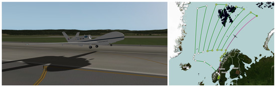 The Ice Hawk mission is an RPAS simulated operation designed to monitor the North Pole ice cover, departing from both Europe and the U.S. The European portion of the mission departs from Runway 01L of Oslo-Gardermoen airport. The RPAS proceeds north until the mission area is reached where an extra-wide scan operation is performed. Once completed, the RPAS returns to the original airport under a different route. The selected cruise flight level is FL640; thus, a long cruise climb operation is necessary to reach that altitude. Figure 11 outlines the test mission as seen in the RAISE [19] simulation environment. The Ice Hawk mission is employed as no detailed flight plan information is available with respect to the real GRIP missions. This mission was designed within the effort carried out by the SESAR ERAINT project to evaluate the impact of RPAS integration in European airspace [11].