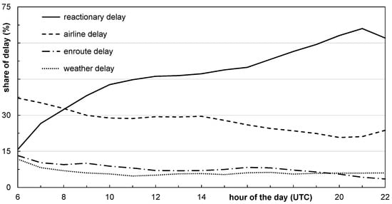 In Figure 2 the departure delay is analyzed and broken down into four delay groupings: airline, reactionary, en route (Air Traffic Flow Management, ATFM), and weather (other than ATFM, but ATFM delays due to weather at destination) delays. This grouping is based on the standard IATA delay codes defined in the Airport Handling Manual [12]. The airline delay causes range from delay code 11 “late check-in (passenger and baggage)” to delay code 69 “captain request for security check”. The reactionary delay (code 91–96) considers causes of load connection: check-in error, rotation (aircraft, crew, cabin crew), and operations control.