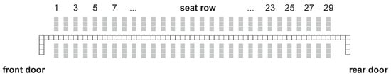 The proposed dynamic model for the boarding simulation is based on an asymmetric simple exclusion process (ASEP, cf. [51]). The ASEP was successfully adapted to model the dynamic passenger behavior in the airport terminal environment [25,52]. In this context, passenger boarding is assumed to be a stochastic, forward-directed, one-dimensional, and discrete (time and space) process. To provide both an appropriate set of input data and an efficient simulation environment, the aircraft seat layout is transferred into a regular grid with aircraft entries, aisle(s) and passenger seats as shown in Figure 3 (reference: Airbus 320, 29 rows, 174 seats). This regular grid consists of equal cells with a size of 0.4 × 0.4 m, whereas a cell can either be empty or contain exactly one passenger.