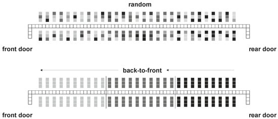 The stochastic nature of the boarding process requires a minimum of simulation runs for each selected scenario in order to derive reliable simulation results. In this context, a simulation scenario is mainly defined by the underlying seat layout, the number of passengers to board (seat load factor, default: 85%), the arrival frequency of the passengers at the aircraft (default: 14 passengers per min), the number of available doors (default 1 door), the specific boarding strategy (default: random), and the conformance of passengers to the current strategy (default: 85%). Further details regarding the model and the simulation environment are provided in [25,39]. To model different boarding strategies, the grid-based approach enables the individual assessment of seats as well as classification/aggregation according to the intended boarding strategy. In Figure 4, the seats are color-coded (grey-scale) and boarding takes place in the order of the grey-scale value (darkest color first). In this context, random boarding means that all passengers possess a pre-assigned seat, but the chronological order of passengers is not specified. To implement the commonly used back-to-front boarding, seats are aggregated to blocks (assignment per row). In fact, back-to-front boarding is often preferred by airlines but is only favorable for a block configuration with fewer than three blocks [25,26].