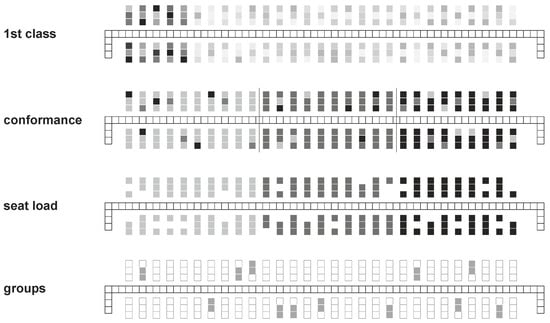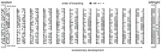 The stochastic boarding model is adapted to allow parallel movement of two passengers along the aisle. Furthermore, the dynamic status of the seat row (folded/unfolded) is implemented to enable/disable this parallel movement. The implementation of these new dynamic aircraft seats demands an appropriately adapted boarding strategy. To identify an optimal boarding sequence, the stochastic simulation model [25,39] was used as a reliable basis for an evolutionary algorithm, which continuously improves an initial set of boarding sequences. As Figure 15 shows, the evolutionary development steps lead to a boarding strategy where passengers on one side of the aisle should be boarded first. A detailed description of the method and results is provided in [43].
