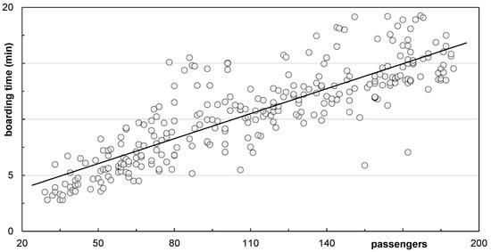 This section provides an overview of the results of the field measurements and boarding trials (further details are available in [47,49]). In Figure 6, the measurements of manually measured 282 boarding events for single-aisle aircraft (Airbus 320, Boeing 737) are shown, with a minimum of 29 passengers and a maximum of 190 passengers. Assuming a linear boarding process, the boarding time increases for each passenger by 4.5 s, with an additional offset of 2.3 min on average (solid regression line in Figure 6).