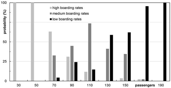 Using a data classification method based on a Q–Q plot, the set of boarding times is separated into three classes with regards to boarding rate (average number of passengers boarded per min): high, medium, and low. The characteristics regarding the amount of passengers according to the classification are shown in Figure 7.Here, the boarding rate possesses a probability of 12% to be high, 73% to be medium, and 15% to be low if 110 passengers are boarded.
