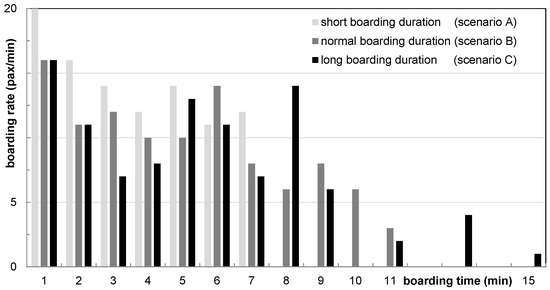To emphasize the operational progress of different boarding events, three boarding scenarios are selected from the recorded data. These scenarios reflect one specific flight on different days (nearly the same number of passengers: 99, 100, and 104) but significantly varying boarding rates and times. In Figure 8, the scenarios show a short (A), normal (B), and long (C) boarding duration. Due to the different passengers’ arrival times, boarding is completed after 7 min in scenario A (average arrival rate of 14.1 passenger/min), after 11 min in scenario B (average arrival rate of 9.4 passenger/min), and after 15 min in scenario C (average arrival rate of 6.7 passenger/min).