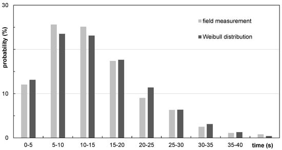 Distribution of time needed to store hand luggage: comparison of field measurements and Weibull distribution.