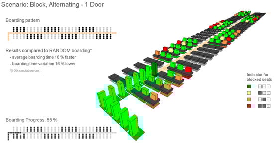 The stochastic boarding model is implemented in a simulation environment, which allows for evaluating specific boarding scenarios with different procedures and technologies. The model was primarily developed to analyze the A320 reference layout in an efficient way, by means of calculation times and consideration of relevant operational constraints. Nevertheless, the model was extended to be used for twin-aisle configuration [39], implementation of infrastructural changes such as the Side-Slip Seat [54], development and optimization of appropriately adapted boarding strategies [43,55], and to derive a complexity metric to predict boarding progress [56]. An additional visualization module is developed to demonstrate the working principle of the analyzed boarding scenarios (see Figure 10). In this section, the results of two different applications of the boarding model are shown: a comparison of different boarding approaches and an innovative infrastructural change in the aircraft cabin to speed up the aircraft boarding [43].