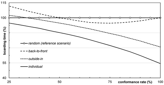 In the following evaluation, a sensitivity analysis is applied with regards to the model parameter of passenger conformance to boarding strategies. The boarding time of the random boarding strategy is used as a reference with a value of 100% (default seat load of 85%). The conformance rate describes the fact that a boarding strategy demands a specific chronological order of passengers (more precise: seats), but this order could only be realized up to a certain level: passengers may arrive late from prior flights (airside connection) or security control (landside connection), privileged passengers could board at any time, and families (groups) will not be separated. It is expected that these disturbances will reduce the effectiveness of boarding strategies. In Figure 11, the average boarding time is shown against an increasing conformance rate. Evidently, the random strategy could not be affected by changes in the conformance rate. The back-to-front strategy shows a decreasing boarding time at the beginning, but after a minimum boarding time (value of 95% at 75% conformance rate), the boarding increases again. The outside-in and individual boarding perform progressively better with increasing conformance.