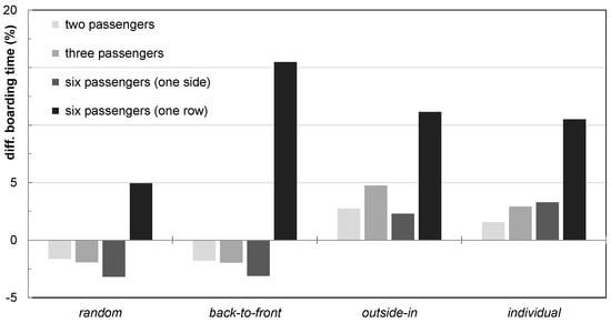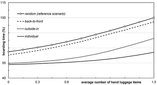 A large amount of hand luggage results in higher boarding times, caused by blocked overhead compartments and additional counterflow passenger movements in the aircraft aisle. Therefore, the potential boarding time savings accomplished by a stepwise reduction in the number of hand luggage items is also addressed. Figure 12 shows a reduction in boarding time if the number of hand luggage items is reduced from an average of 1.5 to zero items per passenger. The initial approach assumed at least one piece of baggage per passenger and probabilities for one piece, two pieces, and three pieces of 60%, 30%, and 10%, respectively [39], and is taken as the baseline to stepwise reduce the number of hand luggage items. As Figure 12 shows, all strategies result in faster boarding. In particular, the boarding time is reduced by 34%, 33%, 25%, and 12% for random, back-to-front, outside-in, and individual strategies assuming a “no hand luggage” rule.